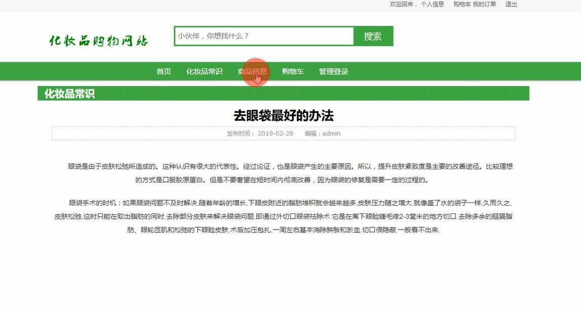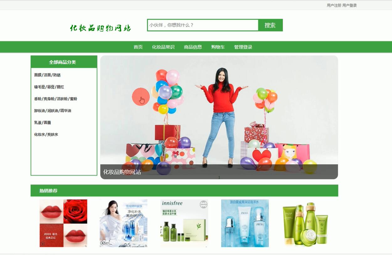 化妆品基本上是每一个美女士家庭必备物品之一。化妆品的准种类比较繁多,而且琳琅满目。化妆品的渠道也比较多,比较靠谱的,是通过到专卖店进行购买。但是随着网络的发展,微商的一些其他不靠谱的商家,也在充斥着化妆品销售市场。通过近几年来的新闻报道,我们也知道微商所销售的化妆品都是一些假冒伪劣产品,而且没有产品质量的保障。但是化妆品是一个特殊的化妆品,对安全的要求比较高。所以为了能够让爱美之人能够通过跟更加方便去安全的渠道购买到自己所需的化妆品,我们开发了本网上化妆品购物网站。