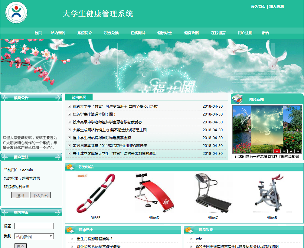 大学生用户可以在前台进行注册登录,站内新闻,系统简介,积分兑换,在线测试,健康贴士,健身攻略,在线留言等操作,并且可以根据自己的锻炼情况换区体育锻炼的器材