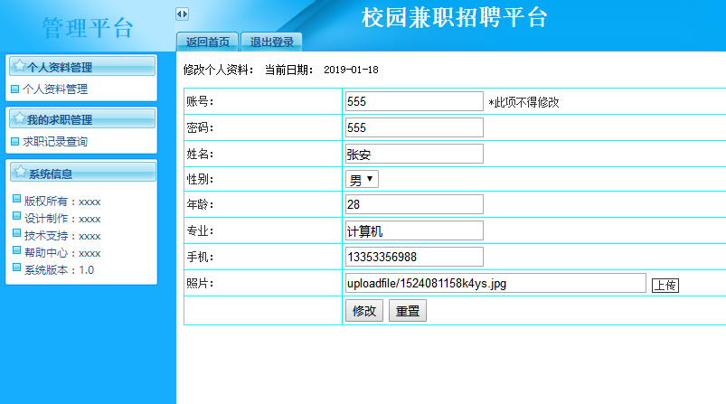 打大学生用户在注册登录之后可以跳转到个人后台,在个人后台中可以查看自己的个人资料以及个人的求职记录等信息。