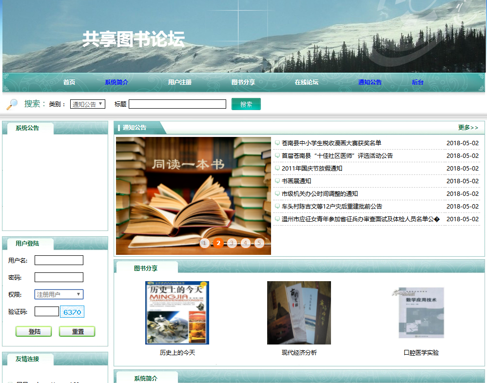 前台部分主要实现了,用户注册登录,查看系统简介,进行图书分享和查看他人分享的图书信息,查看通知公告内容,通过在线论坛进行图书信息的交流。