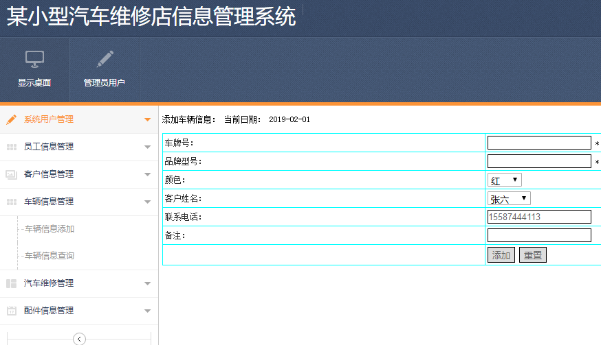 管理员还可以对日常经常维护的一些车辆信息进行管理,在车辆维护管理中输入车辆的车牌颜色,品牌型,型号和所属客户以及客户的联系方式等信息然后点击添加钮即可添加吨的车辆信息到数据库中。