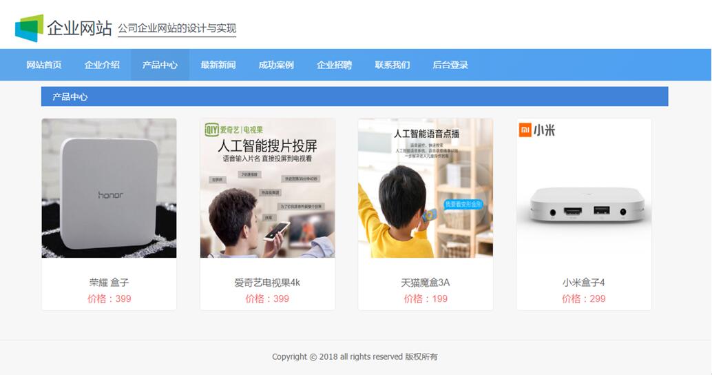作为一个企业网站,公司的产品是本网站展示的一个核心内容,本企业网站主要是电子产品中的机顶盒生产厂家,在产品中心中用户可以图文的形式看到所展示的机顶盒信息。在产品中心中用户可以看到产品的图片,名字以及价格的内容,当用户需要查看某一个产品的详细信息的时候,点击图片即可跳转到该产品的详细页面中去