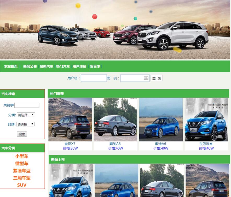 用户如果想要查看汽车信息的话可以同点击首页部分的菜单来进行,当点开了汽车信息后系统会将当前的一些汽车推荐到页面中来,包括汽车的图片,价格和名称等信息,然后用户通过点击汽车的图片可以看到其详情信息