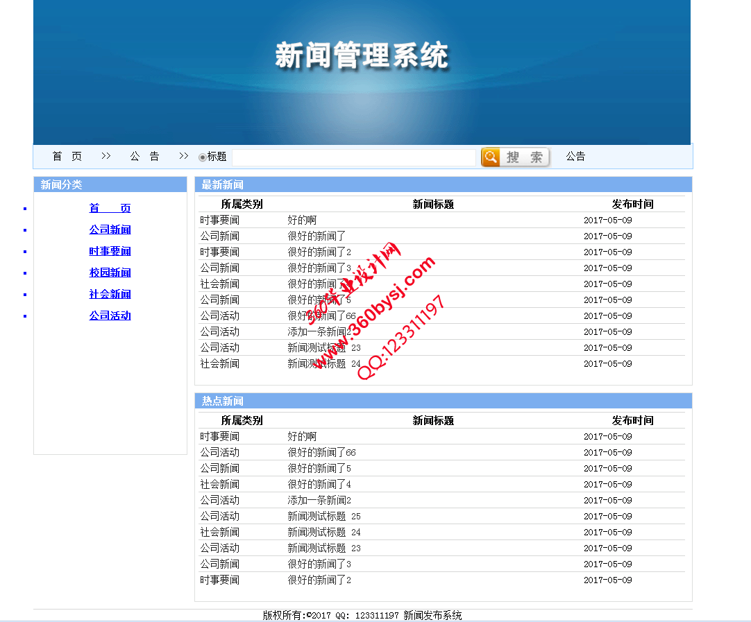 功能介绍本系统的目的是实现国防新闻信息的发布。本国防新闻发布系统主要是发布国防新闻信息,为满足不同用户需求;系统将用户分为:普通用户,系统管理员两种权限。 普通用户能在本系统中进行国防新闻浏览,阅读。每条新闻的标题被做成一个链接,用户点击它们就能跳转页面进行新闻阅读;新闻阅读页面,每条新闻的详细信息将被取出,包括内容、标题等;用户能对新闻进行被评论(允许匿名评论)。 国防新闻发布系统同时还可以再上面发布公告,让普通用户或者浏览者能够更直观的了解该国防发布系统,已经研发者。 系统管理员可以进行新闻分类管理、添加新闻、修改新闻、新闻审核和删除新闻,同时系统管理员能完成用户管理如包括系统用户管理、添加用户和更改账号。 |