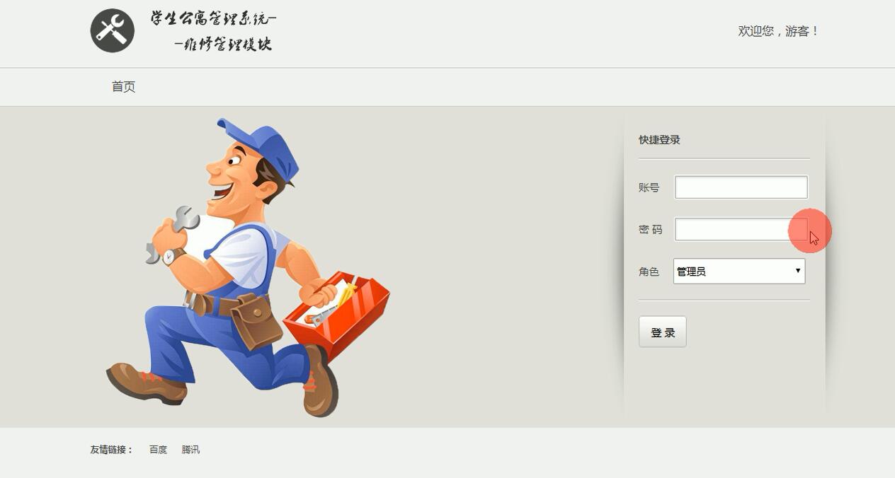 本学生公寓管理系统--维修管理模块主要是给学生公寓维修提供服务,系统分为管理员,维修人员,学生用户三部分。